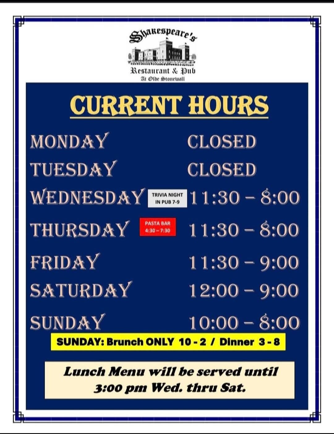 Shakespeare’s Restaurant & Pub at Olde Stonewall Golf Club is a one of a kind, Medieval style dining venue where every customer is “treated like royalty.” The restaurant features an American style cuisine with a casual medieval theme. Diners can enjoy their fare in the air conditioned interior or, weather permitting, on the patio overlooking the 18th green of the world class golf course.